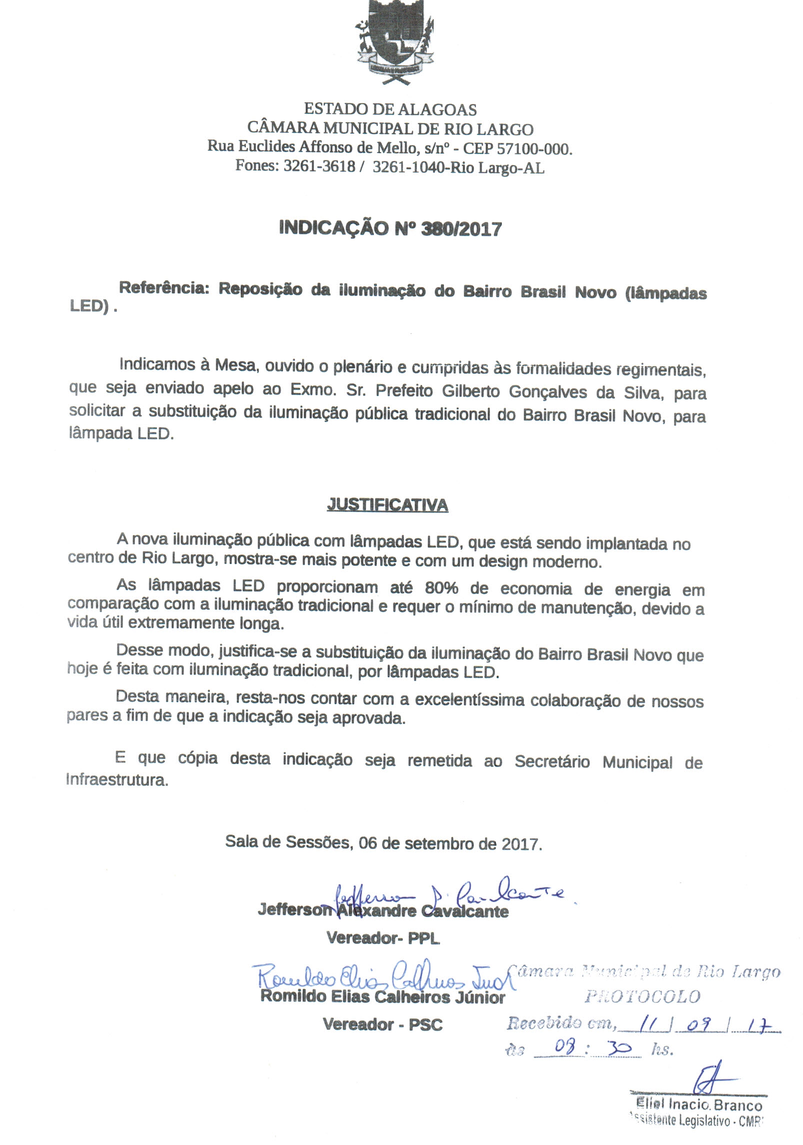 ![]() INDICAÇÃO Nº 340/2017. PROJETO DE ILUMINAÇÃO ENTRE A PONTE DO RIACHÃO E A ENTRADA DE RIO LARGO, PELA CONE(BR 101).