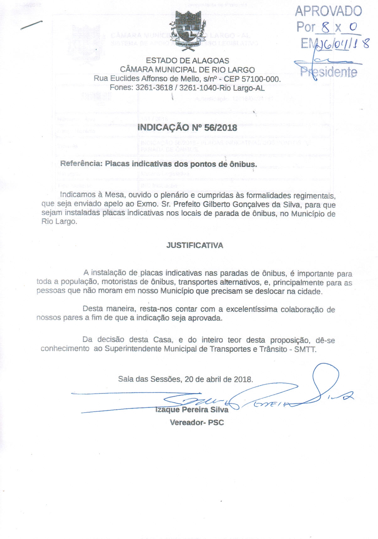 INDICAÇÃO 56/2018 - PLACAS INDICATIVAS DOS PONTOS DE PARADA DE ÔNIBUS. - |