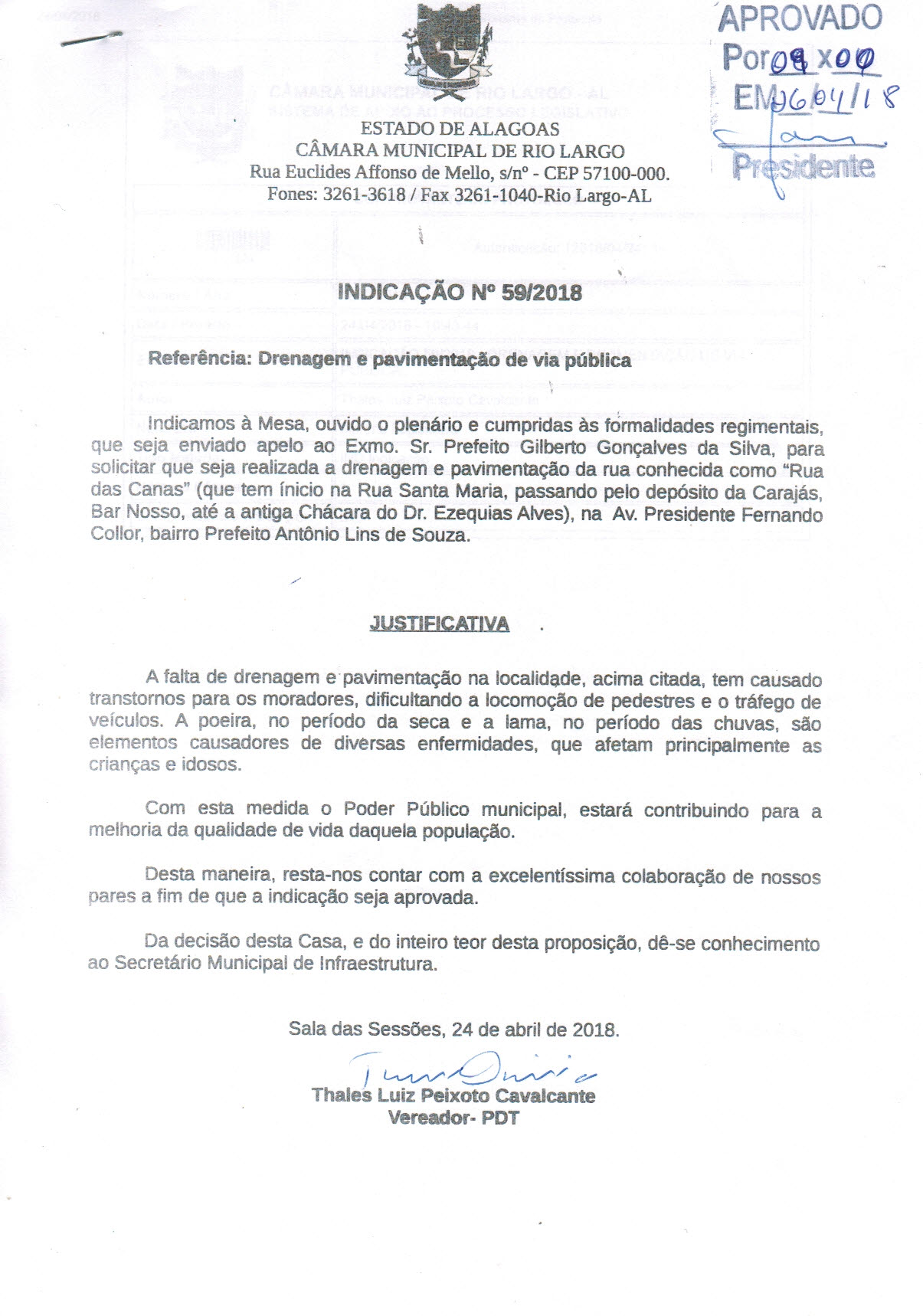 INDICAÇÃO 04/2018 - DRENAGEM E PAVIMENTAÇÃO DE RUA PUBLICA. - |