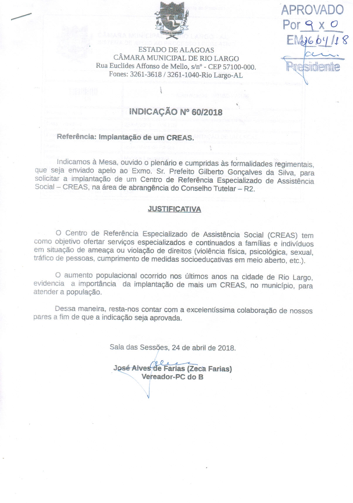 INDICAÇÃO 60/2018 - IMPLANTAÇÃO DE UM CREAS. - |